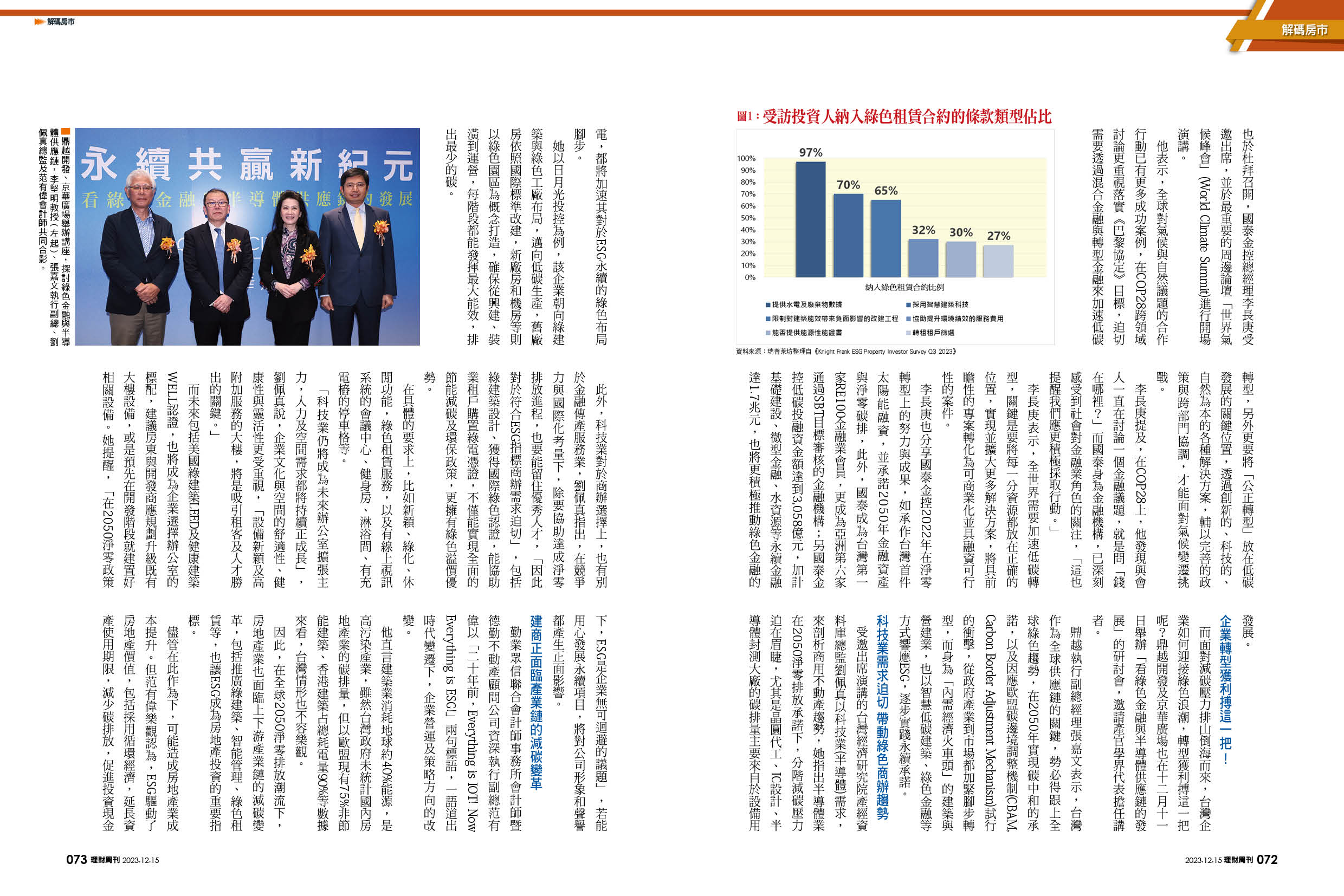 瑞普萊坊本次的調查結果顯示,綠色租賃逐漸成為業界的常態。也就是在標準租約內容之外,再納入涵蓋ESG目標的條款。如此一來,不管房東或租戶都能更有效地管控並提升大樓環境績效。