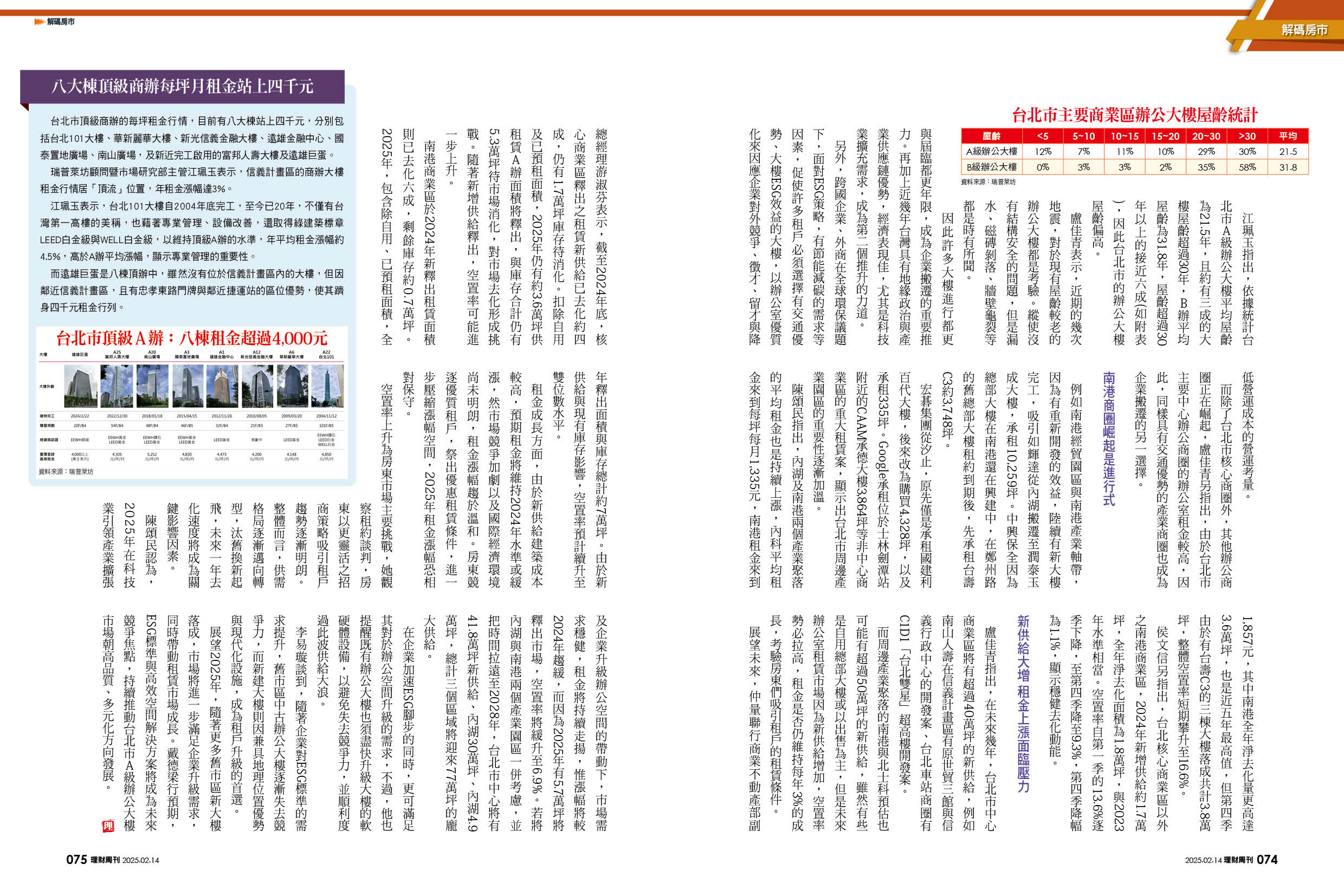 台北市頂級商辦的每坪租金行情,目前有八大棟站上四千元,分別包括台北101大樓、華新麗華大樓、新光信義金融大樓、遠雄金融中心、國泰置地廣場、南山廣場,及新近完工啟用的富邦人壽大樓及遠雄巨蛋。