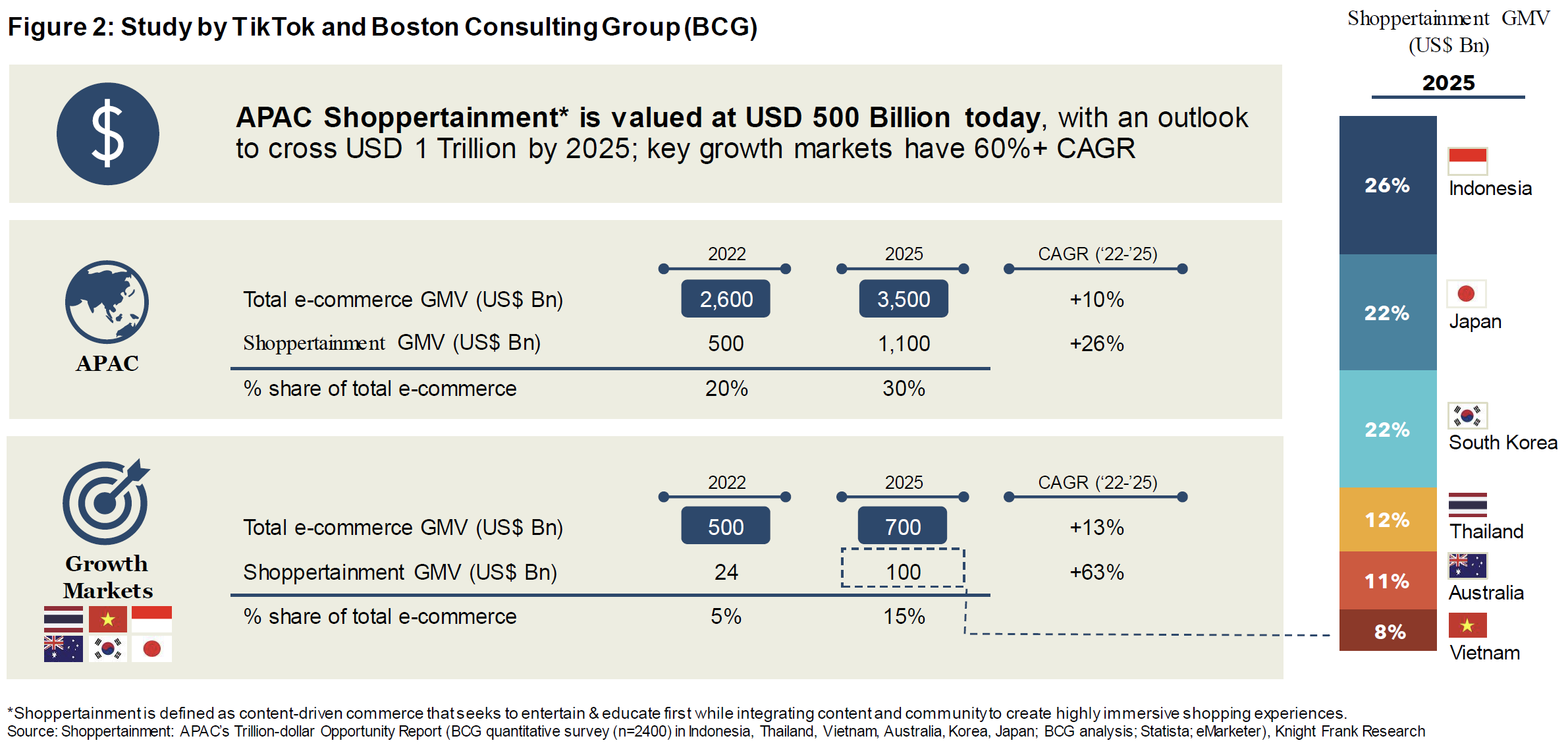 電子商務市場在疫情期間經歷了爆發式增長,即便消費者的購買行為有所回歸實體店,該領域的影響力仍然巨大。TikTok與波士頓諮詢集團的報告預計,到2025年,亞太地區的電子商務總市場價值將達到3.5萬億美元,年均增長率達到10%。