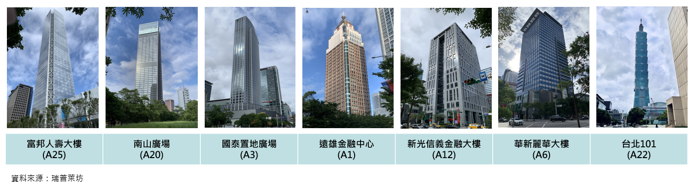 盧佳青指出,這七棟大樓分別是國泰置地廣場、台北101大樓、新光信義金融大樓、華新麗華大樓、遠雄金融中心、南山廣場,及今年新完工的富邦人壽大樓A25。