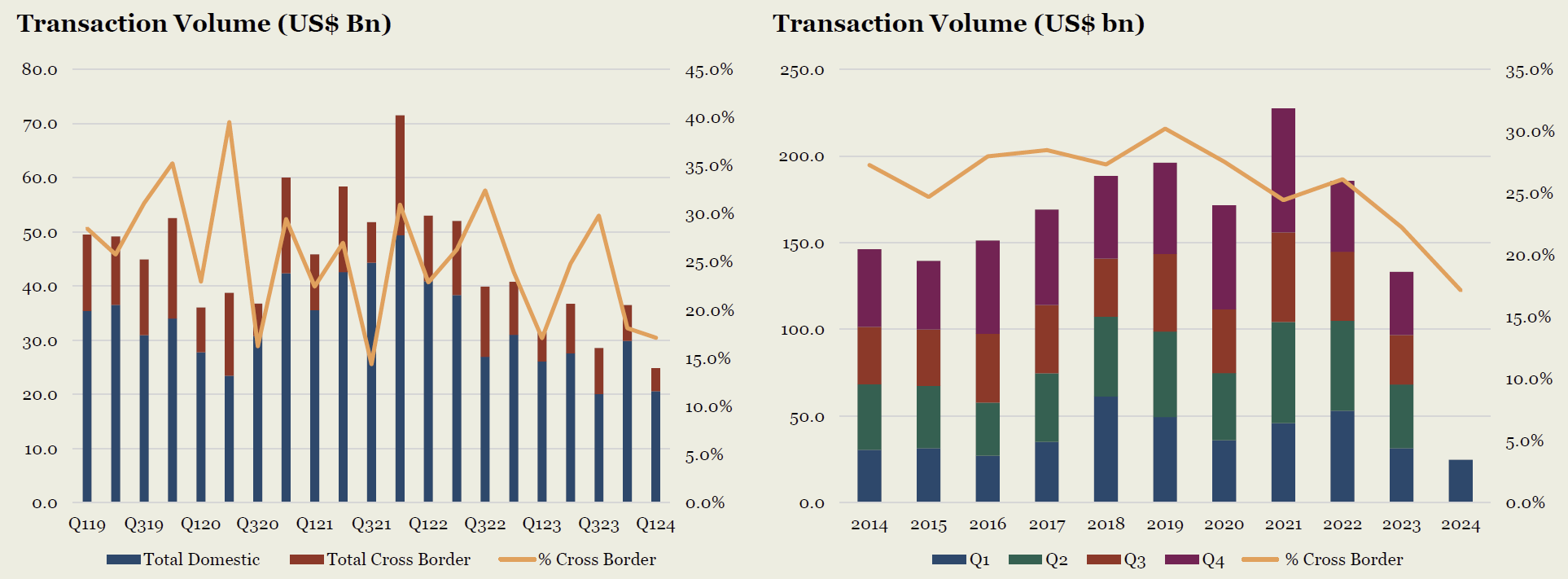 • 跨境交易較國內交易跌幅更大,分別下降 35.6% 和 31.1%。