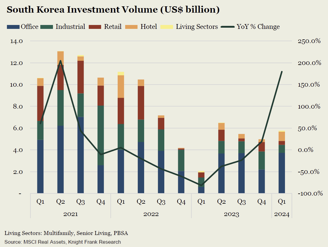 • 辦公室資產仍是主要投資標的,佔總投資量的 39%,南韓和日本的高價交易領先。