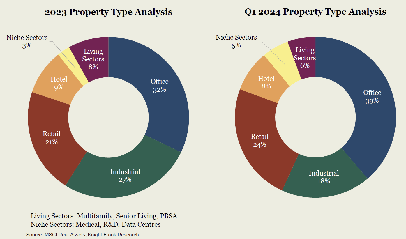 • 辦公室交易量較上季倍增,工業資產亦受高收益預期吸引。