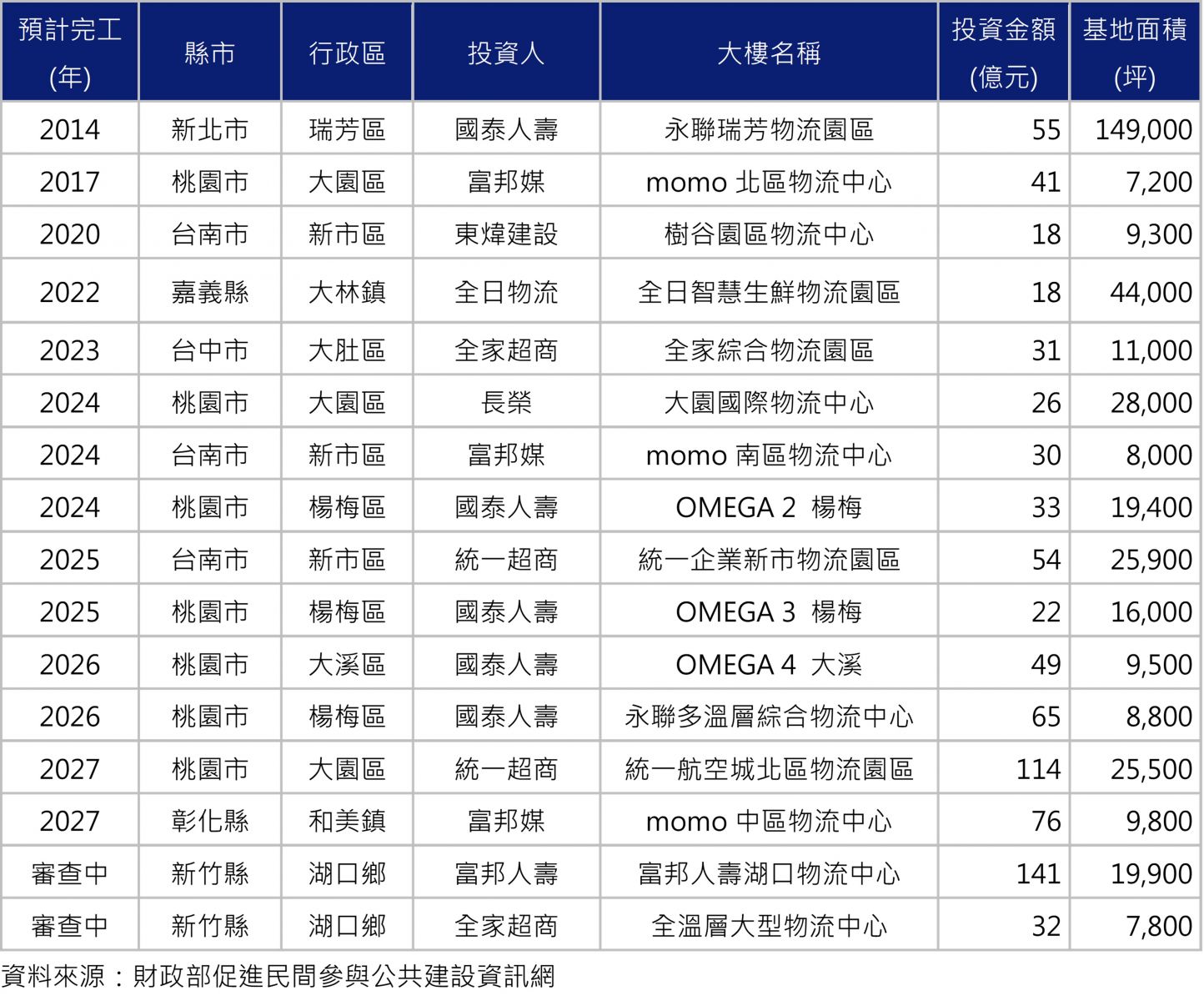 2. 內需熱絡帶動物流中心需求:台灣內需消費市場營業額屢創新高,傳統零售商及電子商務廠商對倉儲物流的需求增加。傳統零售包括統一超、全家、全聯等常溫及冷鍊配送的物流需求,電商則有momo、PChome、蝦皮等,除了承租現有倉儲空間,也不乏購地自建的案例,如統一超商預計於2025年啟用的台南新市物流園區,以及2027年完工的航空城北區物流中心(詳見附表)。
