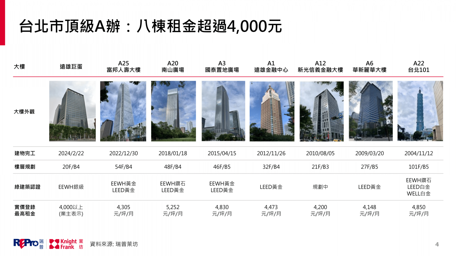 台北市頂級商辦的每坪租金行情,目前有八大棟站上四千元,分別包括台北101大樓、華新麗華大樓、新光信義金融大樓、遠雄金融中心、國泰置地廣場、南山廣場,及新近完工啟用的富邦人壽大樓及遠雄巨蛋。
