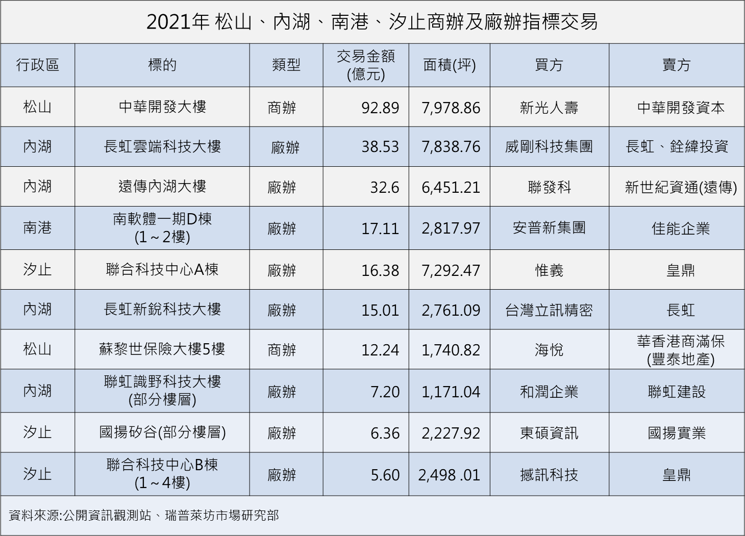第三,供需失衡、防疫意識抬頭,辦公需求東移。根據瑞普萊坊市場研究部統計今年第二季台北市A辦空置率為2.97%,正式跌破3%,即使新增供給的元大人壽也因供集團使用,全屬自用,因此無法緩解租金漲、空置跌的供不應求結果,間接帶動辦公需求往東移動的趨勢。劉美華解釋,上半年雙北市的商辦、廠辦交易總金額約294億元,但發生在松山、內湖、南港、汐止就佔了85%。根據萊坊(Knight Frank)最新的調查,51%的亞太區未來三年內有搬遷總部的計畫,相較全球平均只有38%,顯見受到成本、招募、防疫的需求強,未來辦公板塊將出現分散及挪移。